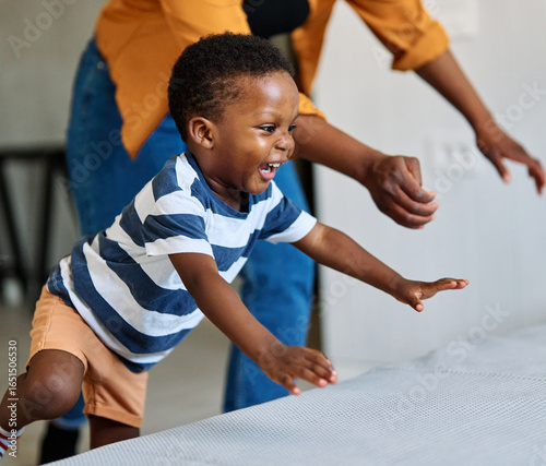 Portrait of mother and son having fun at home in bedroom, family life, parenting, love and bonding concepts