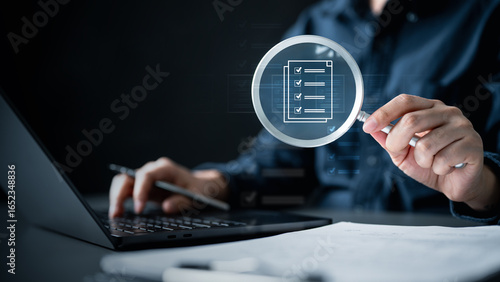 Magnifying glass document management checklist. Magnifying glass check mark approved. Audit certificate evaluate examination reviewing. Magnifying inspector inspect quality Assurance selection summary