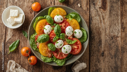 Fresh salad with golden tomatoes, aromatic basil, and soft mozzarella on a wooden table seen from the top. Space available for text