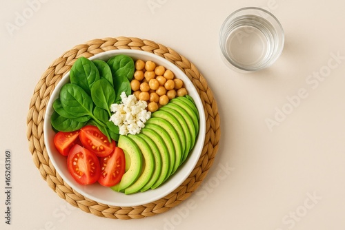 Wholesome Vegetarian Meal Displaying Avocado, Chickpeas, Feta, Spinach, and Tomatoes Paired with a Glass of Water – Detox and Balance in a Top-Down Perspective with Room for Copy