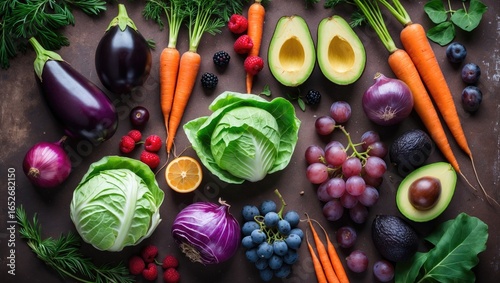 Vibrant assortment of raw organic purple vegetables and fruits such as eggplants, onions, berries, carrots, grapes, cabbage, avocados, and plums arranged on a rustic background, ideal for gluten-free