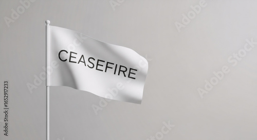 White flag with the word ceasefire on a pole signaling for peace and a halt to conflict. Concept for negotiation.