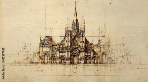 Ornate gothic cathedral architectural sketch with intricate details and construction lines detailed drawing