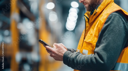 A male worker in a bright yellow high visibility safety vest is standing outdoors while looking at and using his mobile cellular device for communication or work related tasks