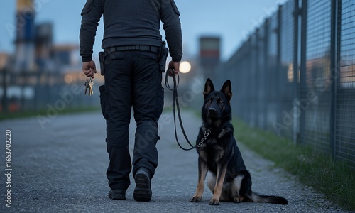 Security Guard with Trained German Shepherd Dog on Patrol