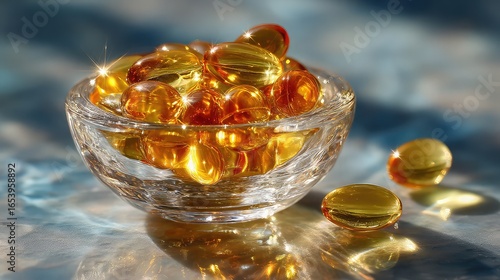 Crystal bowl filled with omega 3 fish oil capsules on a blue surface