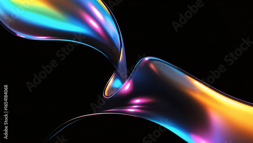 Dark abstract futuristic background. Iridescent fluid wave render. Glass prism light refraction. Rainbow gradient flare. Smooth transition. Bright glow shimmer. Neon metallic blur texture.