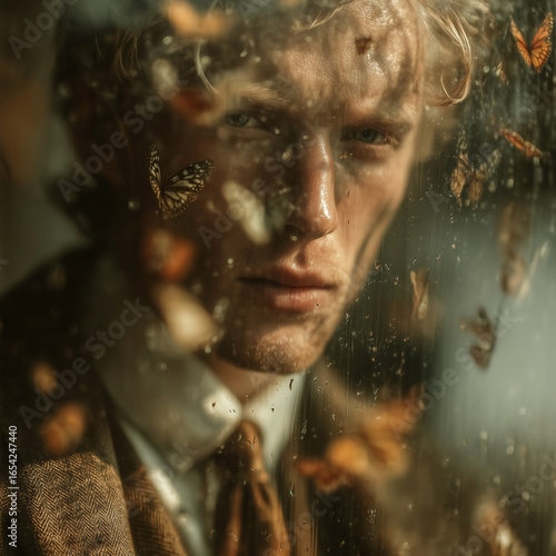 A man in a brown suit looks through a glass covered with raindrops, behind which butterflies flutter.