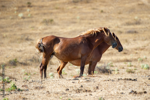 Two brown horses stand closely together in a dry field, creating an optical illusion as their aligned heads appear to merge into one.