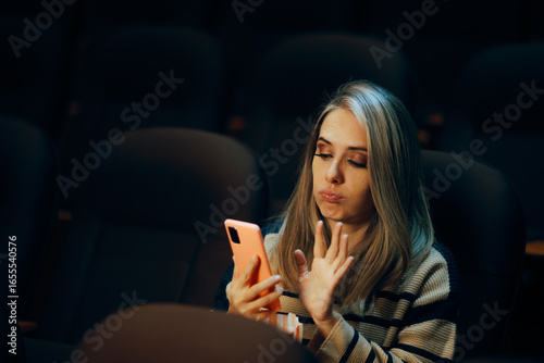 Woman in a Movie Theater Checking her Phone Waiting for her Date. Bored single lady doom scrolling during a play in a theater