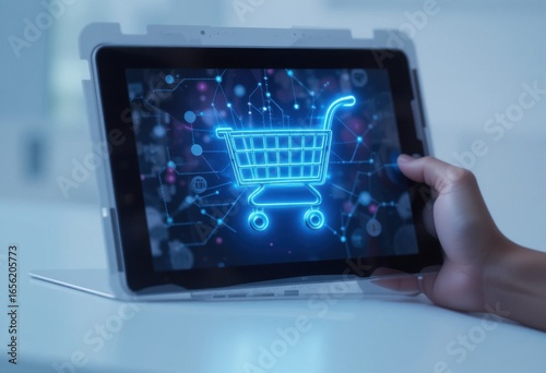 Una tableta digital con un icono holográfico de carrito de compras brilla en el aire. Simboliza el comercio electrónico, la venta minorista en línea y el mercado digital moderno