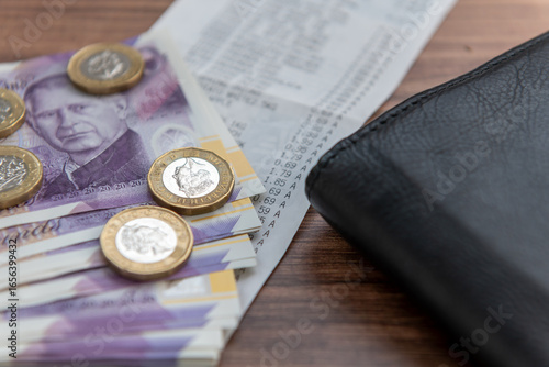A UK cost of living concept with Sterling bank notes and coins, a grocery receipt and a purse.