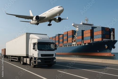 Multimodal transportation with airplane cargo ship and truck on road logistics aircraft