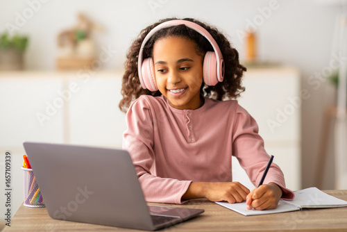 Black teen girl in wireless headset doing homework, using laptop and taking notes in her exercise book. Schoolgirl staying home during coronavirus pandemic, having online video class