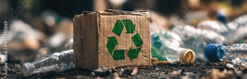 Close-up of a recycled cardboard box with a green recycling symbol on a polluted water with plastic debris and trash in the background