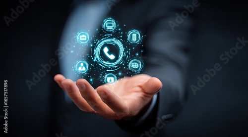 Hand holding a glowing digital phone icon, surrounded by other communication symbols, representing integrated communication technology