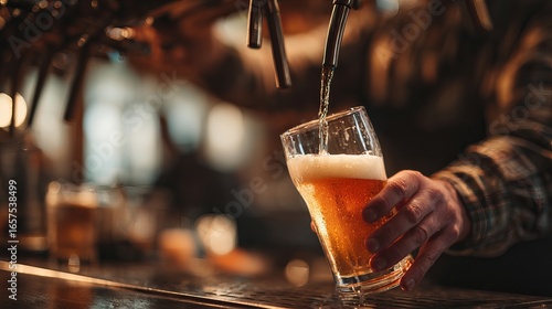 Pouring golden craft beer into a glass, creating frothy head, perfect pint moment