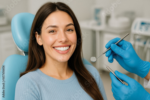 Smiling female dental patient sitting relaxed dentist chair confident white teeth preventive oral care promotion modern clinic interior