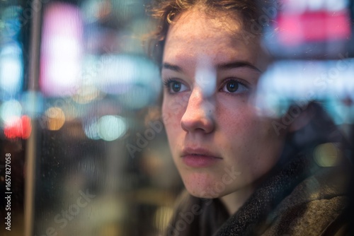 A person gazes intently at their reflection amidst the vibrant city backdrop, lost in contemplation during a bustling day. The atmosphere is lively yet introspective