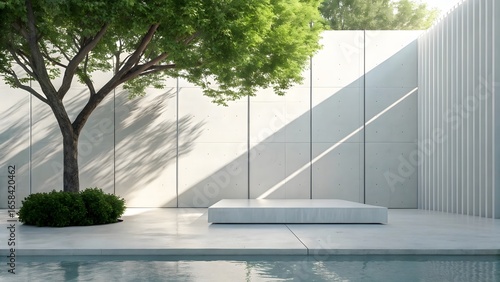 Modern minimalist courtyard with a tree and a bench by a pool