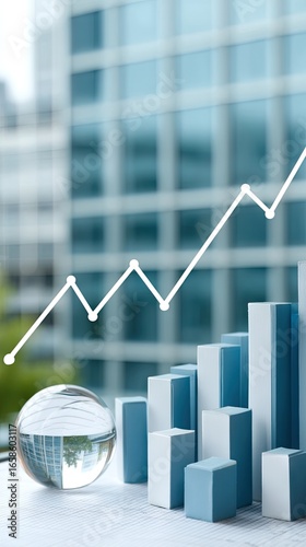 Business growth trends illustrated with bar graphs and a reflective sphere in a modern office setting