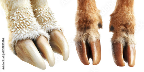 Set of realistic animal hooves close up of front and back legs, isolated on transparent background