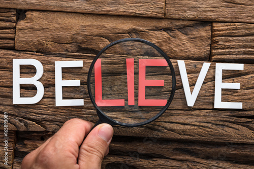Hand Holding Magnifying Glass Over Word Lie In Believe