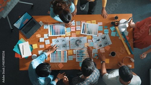 Top down view of designer compare color palettes with laptop and design product. Aerial view of marketing team working together to choose color while discussing about logo graphic design. Symposium.