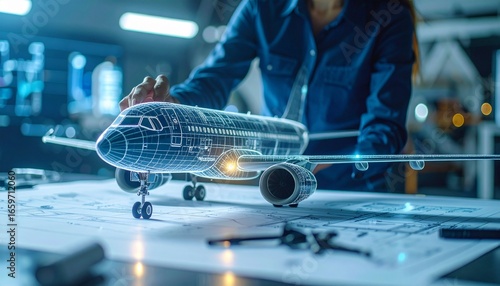 An airplane design and engineering concept. A skilled technician works on a detailed model of an airplane, visualizing its structure and mechanics with intricate details.