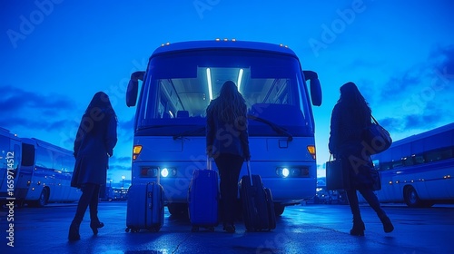 Three individuals with luggage make their way to a waiting bus under a serene twilight sky, hinting at evening travels