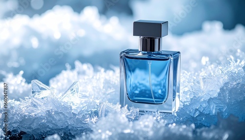 Blue perfume bottle with gold cap nestled in fresh snow, surrounded by frosty branches and soft winter light for a cool, seasonal elegance.