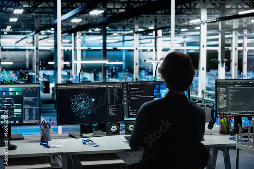 Engineer monitoring AI LLM visualization in data center with rows of operational server racks. IT expert using PC to oversee rigs powering deep learning in server hub built for digital storage systems