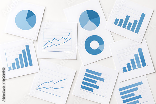 Multiple printed business charts and graphs including bar, pie, and line charts spread on white surface for analysis
