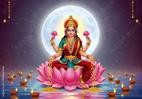 A beautiful depiction of Lakshmi Puja for the Diwali festival, with the goddess of wealth on a lotus, surrounded by light