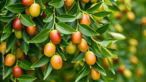 Fresh jojoba plant tree with clusters of ripe fruits, natural outdoor setting, healthy foliage, vibrant agricultural scene, close-up detail of leaves and fruits