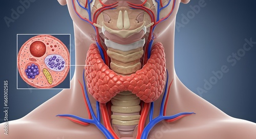 Illustration of the human thyroid gland with a zoomed-in view of thyroid follicles and cells in a dark blue background.