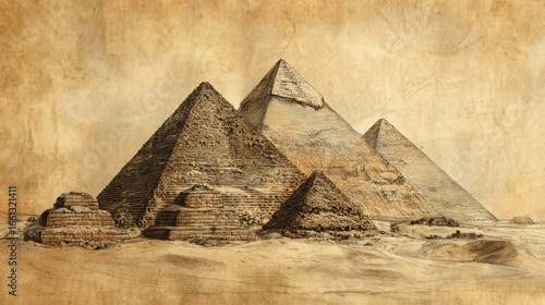 Sketch-style pyramids rise in Egypt on tan, textured paper. Warm, faded color palette