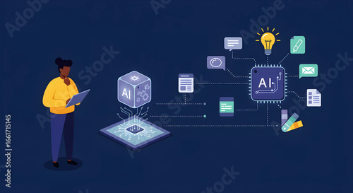 人間とAIが協働しイノベーションを創出する未来のビジネス。生成AI活用のコンセプトを描いたベクターイラスト。