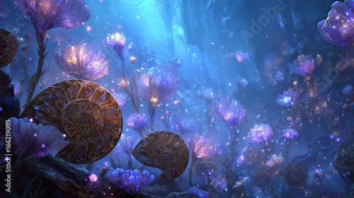 Glowing purple and blue translucent flowers surrounding detailed spiral ammonite shells in a serene, mystical underwater garden with soft blue lighting in 4K resolution