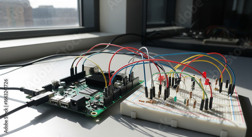 A detailed shot of a Raspberry Pi board connected to a breadboard with various electronic components. The image highlights a series of resistors, LEDs, and colorful jumper wires