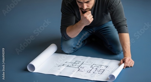 Concentrated architect kneeling on the floor, thoughtfully examining a detailed house blueprint plan