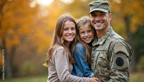 Proud military member in uniform reunites with smiling family daughters. Father, children share joyful reunion, expressing love, connection outdoors amidst autumn foliage. Family togetherness