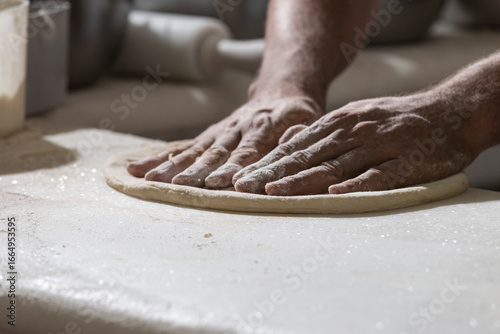 Chef pizzaiolo prepara uma pizza abrindo a massa com as mãos