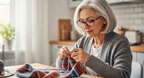 Elderly caucasian woman knitting in cozy kitchen setting