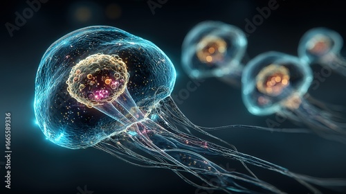 Microscopic cells with visible nuclei and translucent membranes on a dark background.