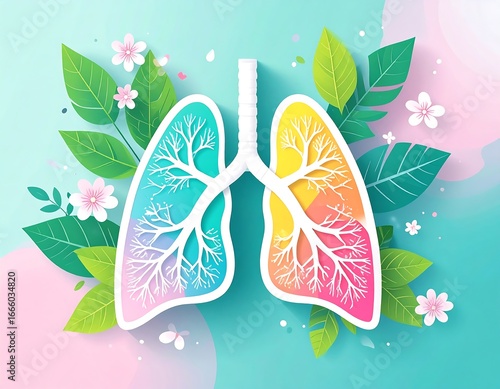 Colorful paper-cut lungs surrounded by leaves and flowers on a pastel background
