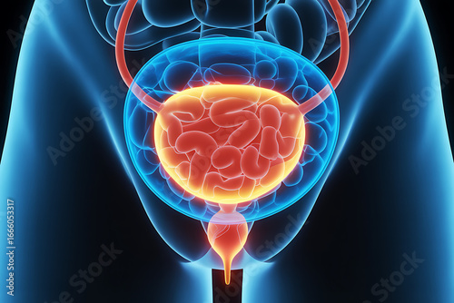 3d medical illustration of the urinary bladder with ureters prostate and urethra highlighted showing pelvic anatomy urination pathway and urology concept for healthcare education and diagnosis