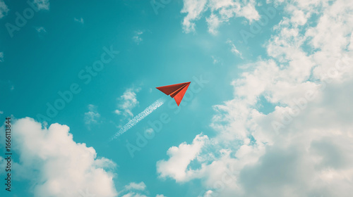 Red Paper Airplane Flying in Blue Sky with Clouds and Copy Space