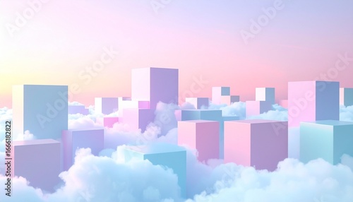 Pastel cubic buildings float among fluffy clouds in a dreamy sky, blending surreal architecture with soft pinks and blues—evoking a whimsical, ethereal city suspended in imagination.