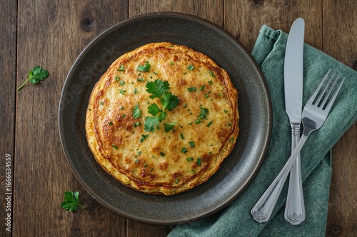 Healthy silken tofu stuffed omelette with fresh herbs, served on a rustic wooden table with cutlery